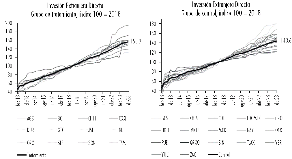 El comportamiento de las nuevas inversiones y reinversiones de las entidades del grupo de tratamiento y control antes del inicio del tratamiento presentan una menor varianza en comparación con el periodo posterior a julio de 2020 (véase Figura 7). En relación con el grupo de tratamiento, entre 2013 y 2019 registró un crecimiento promedio anual de 14.6%, mientras que a partir de julio de 2020 y hasta diciembre de 2023 creció 8.2%. En particular, la entidad con mayor crecimiento posterior al tratamiento fue Durango con un incremento promedio de 15.4%, aunque es importante mencionar que esta entidad representa 2.2% de las nuevas inversiones y reinversiones en este grupo. En tanto, el crecimiento anual promedio del grupo de control entre 2013 y 2019 fue de 14.3%; el menor crecimiento corresponde a Quintana Roo, que creció 11.2% y el mayor crecimiento corresponde a Oaxaca, que creció 32.5%, es decir, 2.9 veces más. Después del periodo de tratamiento el crecimiento promedio anual del grupo de control fue de 6.3% y el menor crecimiento lo registró Oaxaca con un crecimiento promedio de 2.9%. Destaca también el caso de Guerrero, que entre 2013 y 2019 en promedio creció 26.6% anual, 1.8 veces más que el promedio del grupo, mientras que entre julio de 2020 y diciembre de 2023 creció a un ritmo promedio de 6.6% anual. Es importante resaltar que se decidió excluir a la Ciudad de México del estudio, por ser el centro financiero y económico del país, esto hace que la IED se registre administrativamente en esta entidad, a pesar de que el destino es hacia otras entidades.11