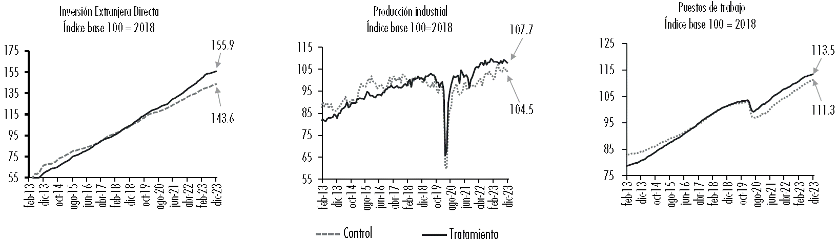 En la Figura 8 se visualiza la evolución de los indicadores antes analizados contrastando el grupo de control y tratamiento. En ella se puede observar que, en la actividad industrial, la diferencia entre las entidades de control y tratamiento al mes de diciembre de 2023 fue de 3.3 pp. Lo que se explica porque en mayo de 2020 las entidades del grupo de control cayeron en promedio 8.7 pp más que las de tratamiento, probablemente porque sus economías no se encontraban tan integradas en las CGV, como sí lo están las unidades tratadas. En relación con el indicador de las nuevas inversiones y reinversiones, la diferencia al mes de diciembre de 2023 fue de 12.2 pp. Esto se explica porque entre julio de 2020 y diciembre de 2023, el crecimiento promedio anual de este indicador fue de 6.3% para el grupo de control y 8.2% para el grupo de tratamiento. Finalmente, para el número de puestos de trabajo la diferencia al mes de diciembre de 2023 fue de 2.2 pp. La explicación es similar a la de la actividad industrial (véase Figura 8), el grupo de control presentó una mayor caída, probablemente porque los puestos de trabajo de las entidades no tratadas se encuentran en el sector servicios, los cuales no se declararon actividades esenciales y además dependen en mayor medida de la demanda interna.