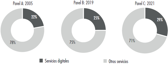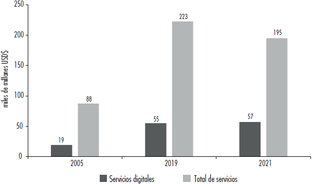 El sector de servicios predomina en las economías y en la generación de empleo en América Latina y el Caribe (ALC), representando entre la mitad y dos tercios de estos agregados en los países de la región (UNCTAD, 2019). Desde el inicio de este siglo se ha observado un crecimiento sostenido en el comercio mundial de servicios, superior al comercio de bienes. Este hecho se evidencia con mayor fuerza en los denominados servicios digitales (SD).
