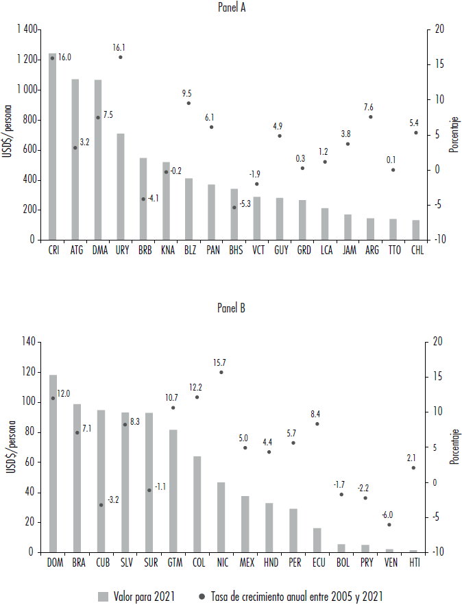 Figura 3 Exportaciones por habitante y tasas de crecimiento de SD en ALC, 2021