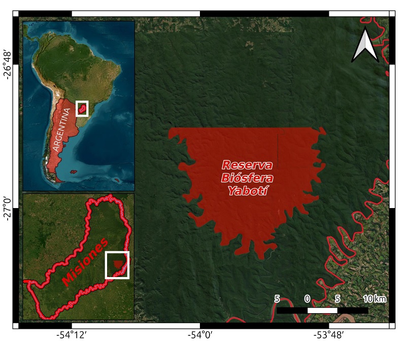 El trabajo se realizó en la reserva de la biosfera Yabotí, Misiones, Argentina (Fig. 1), la cual abarca parte de los departamentos Guaraní y San Pedro. En ella se lleva a cabo un programa de manejo en un marco de desarrollo sustentable; estas áreas pertenecen a la Selva Paranaense (Ley Provincial XVI - Nº 33, antes Ley 3041).