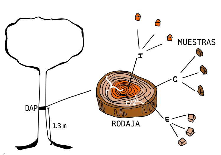 Se identificaron en campo tres áreas de fácil acceso, que fueron intensamente aprovechadas en el pasado. En cada área y de cada especie arbórea, se seleccionaron un máximo de dos ejemplares de entre 3 cm y 10 cm de diámetro a 1.3 m de altura (DAP). De cada individuo se extrajo una rodaja de madera con corteza a esa misma altura. Las especies fueron: Campomanesia xanthocarpa O. Berg (CAXA), Cedrela fissilis Vell. (CEFI), Chrysophyllum marginatum (Hook. & Arn.) Radlk. (CHMA), Lonchocarpus muehlbergianus Hassl. (LOMU), Luehea divaricata Mart. (LUDI), Muellera campestris (Mart. ex Benth.) M.J. Silva & A.M.G. Azevedo (MUCA), Nectandra lanceolata Nees & Mart. (NELA), Nectandra megapotamica (Spreng.) Mez (NEME), Parapiptadenia rigida (Benth.) Brenan (PARI), Pilocarpus pennatifolius Lem. (PIPE), Sebastiania commersoniana (Baill.) L.B.Sm. & Downs (SECO), Solanum granuloso-leprosum Dunal (SOGR), Trema micrantha (L.) Blume (TRMI) y Trichilia claussenii C. DC. (TRCL). Cada rodaja se dividió en tres secciones: corteza (C), xilema exterior (E) y xilema interior (I) (determinados los últimos dos por la mitad del radio de la muestra sin corteza) y se obtuvieron al menos tres muestras por sección (Fig. 2) de un peso mínimo de 0.5 g.