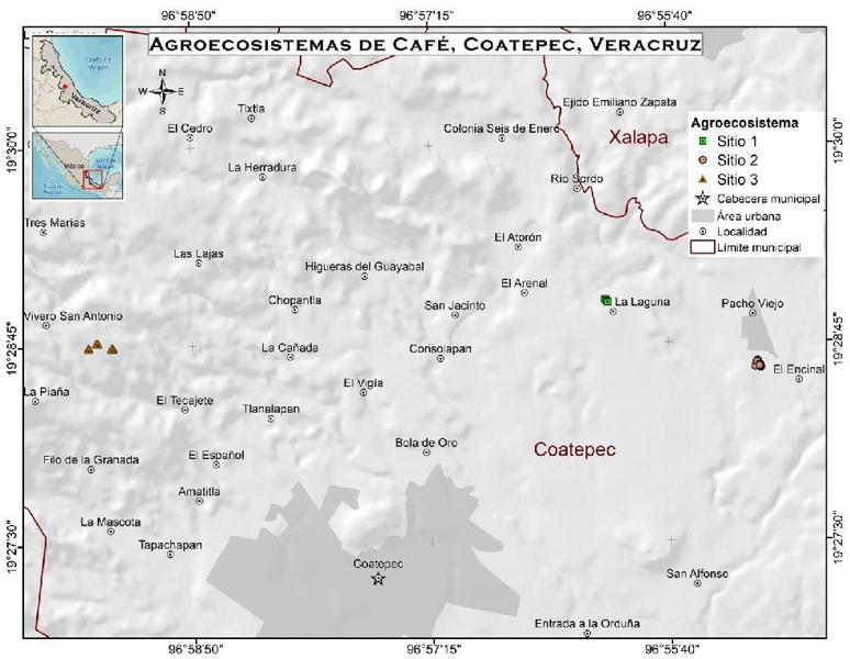 El municipio de Coatepec, Veracruz, se ubica entre los 19° 21' y 19° 32' de latitud norte; y 96° 47' y 97° 06' de longitud oeste; tiene una altitud entre 500 m y 2900 m s.n.m. Coatepec posee diferentes tipos de clima: semicálido húmedo con abundantes lluvias en verano, semicálido húmedo con lluvias todo el año, templado húmedo con lluvias todo el año, cálido subhúmedo con lluvias en verano y semifrío húmedo con abundantes lluvias en verano (Instituto Nacional de Estadística y Geografía [Inegi], (2015). La temperatura media anual es de 19 °C con una precipitación acumulada promedio anual de 1854 mm. Cuenta con 93 911 habitantes, de los cuales, 48% son hombres y 52% son mujeres (Data México, 2024). Esta investigación se desarrolló analizando tres agroecosistemas cafetaleros ubicados en este municipio. Los sitios fueron seleccionados con base en su ubicación (dentro del municipio de Coatepec), la superficie (entre 0.25 ha y 3 ha), fácil acceso y la disposición de los propietarios para participar en la investigación. La ubicación de los agroecosistemas seleccionados se muestra en la figura 1 y sus principales características en la tabla 2.
