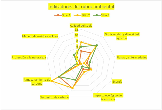 Los tres sitios obtuvieron un índice ambiental (IA) promedio de 2.48, indicando, en general, que los tres cafetales son ligeramente sustentables en este aspecto (Tabla 8; Fig. 2). De tal modo, este rubro es más alto respecto al resto (económico, social y técnico). El sitio con el IA más alto fue el 2 (IA = 2.79) categorizándose como fuertemente sustentable, seguido del sitio 3 (IA = 2.47) y por último el sitio 1 (2.18) considerados ambos ligeramente sustentables.