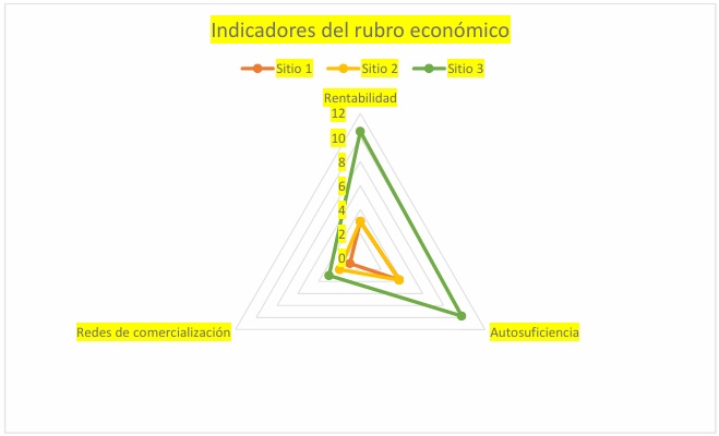 Los tres sitios obtuvieron un índice económico (IE) promedio de 1.89. Esto indica que el nivel de sustentabilidad promedio está por debajo del umbral (valor 2) por lo que no se consideran sustentables en este rubro (Tabla 9; Fig. 3). Sin embargo, el sitio con el índice económico más alto fue el 3 (IE = 3.32) considerándose por si solo muy sustentable, seguido del sitio 2 (IE = 1.25) y, por último, el sitio 1 (IE = 1.11), considerándose estos dos como no sustentables.