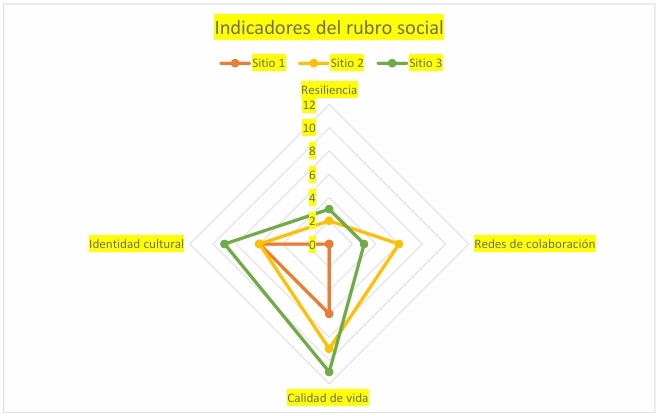 Los tres sitios obtuvieron un índice social (IS) promedio de 2.03, lo que indica que el nivel de sustentabilidad en este aspecto está por arriba del umbral (valor 2), por lo que todos son ligeramente sustentables (Tabla 10; Fig. 4). Sin embargo, el sitio con el índice social más alto fue el 3 (IS = 2.60), el cual, por sí solo, fue fuertemente sustentable, seguido del sitio 2 (IS = 2.30), que resultó ligerametne sustentable y por último el sitio 1 (IS = 1.20), catetgorizado como no sustentable.
