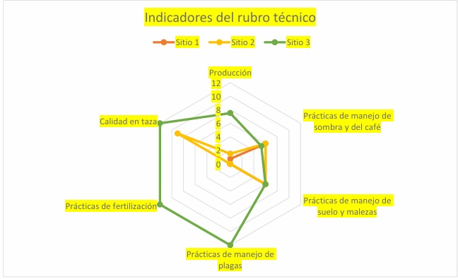 De acuerdo con Escamilla Prado y Díaz Cárdenas (2016), el cultivo de café en México se inició con escaso manejo e insumos y con bajo rendimiento. Esto coincide con los resultados obtenidos en este rubro, ya que este aspecto obtuvo el índice más bajo respecto a los demás (IT=1.81). A pesar de la escasa tecnología, los sitios estudiados registraron prácticas de manejo de suelo y malezas óptimas, mostrando en dos de los tres sitios un interés por caminar hacia una agricultura más ecológica.