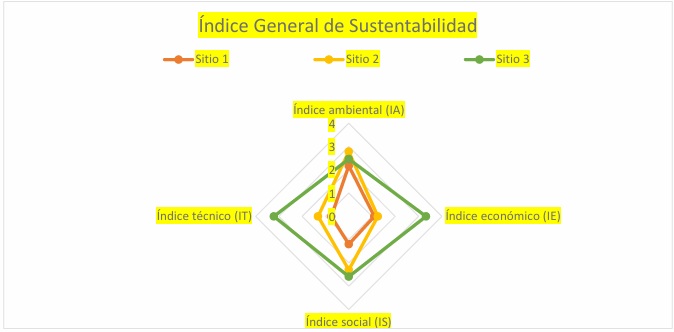 El IGS promedio para los tres sitios fue de 2.05, que clasifica al conjunto como ligeramente sustentables. De manera individual, el sitio 3 obtuvo un IGS = 2.90, que lo cataloga como fuertemente sustentable; mientras que el sitio 2 obtuvo un IGS = 1.92 y el sitio 1 un IGS = 1.34, es decir ambos se consideran no sustentables. El rubro con el índice más alto en los tres sitios fue el ambiental IA = 2.48, seguido del social IS = 2.03, enseguida el económico IE = 1.89 y, por último, el rubro técnico IT = 1. 81 (Tabla 12; Fig. 6).