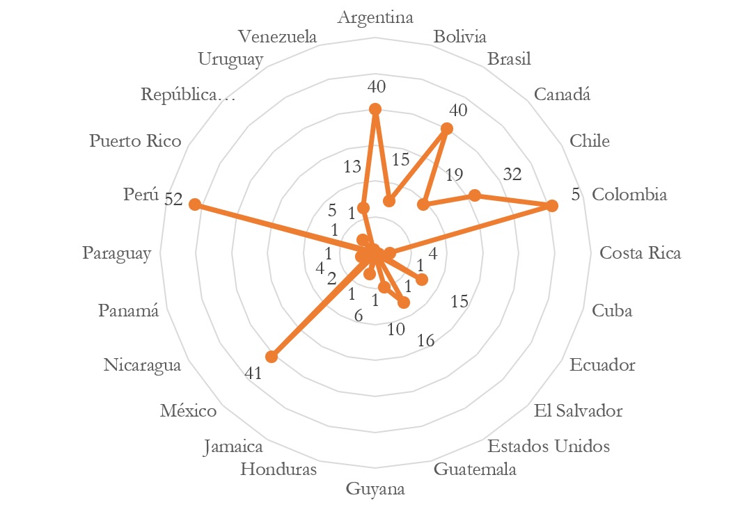 La violencia ejercida contra los defensores ambientales a escala global parece recrudecer en años recientes, siendo 2020 el año en el que se ha registrado el mayor número de homicidios de activistas, con 227 víctimas (Global Witness, 2021). Dentro del continente americano, ALC es una de las regiones más peligrosas para la defensa del territorio y el ambiente. Para 2022, 88% de los asesinatos de activistas ocurrieron en ALC, porcentaje que ubica a la región como la más peligrosa a nivel mundial para las personas defensoras de los derechos ambientales y los territorios (Global Witness, 2023). En años recientes, las naciones más mortíferas para la defensa del ambiente han sido Colombia, Brasil y Perú (Global Witness, 2023).