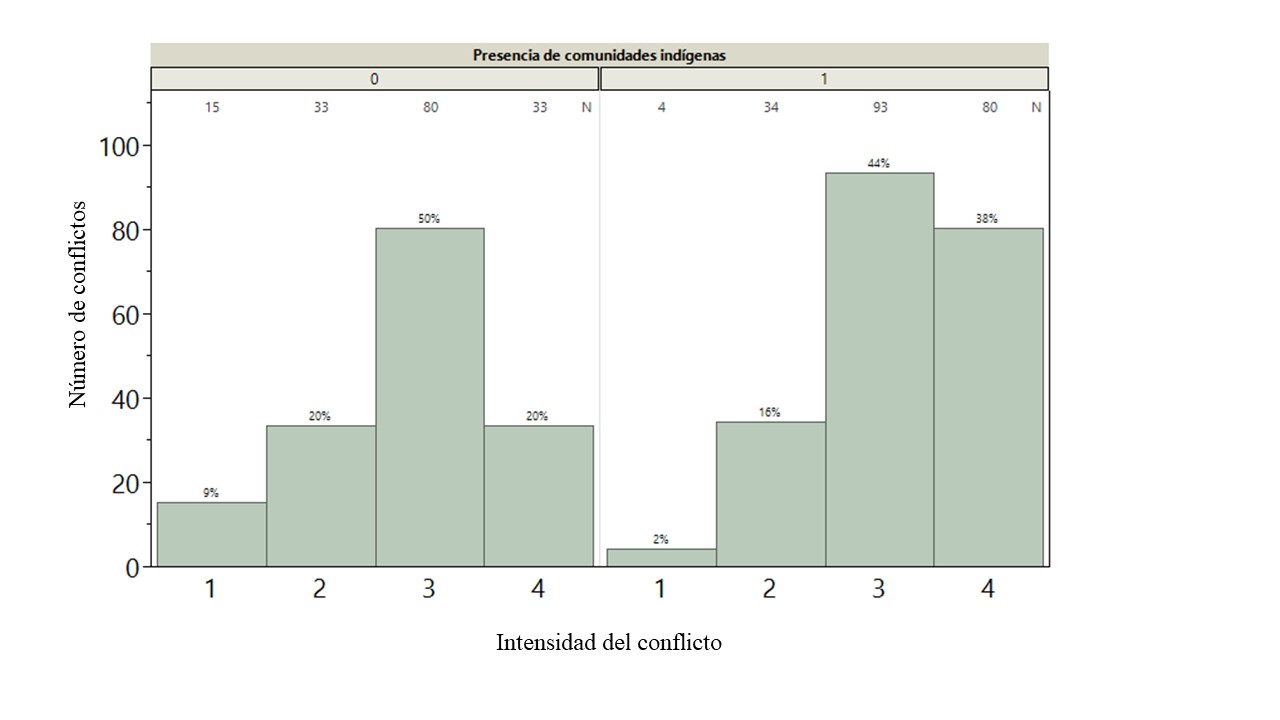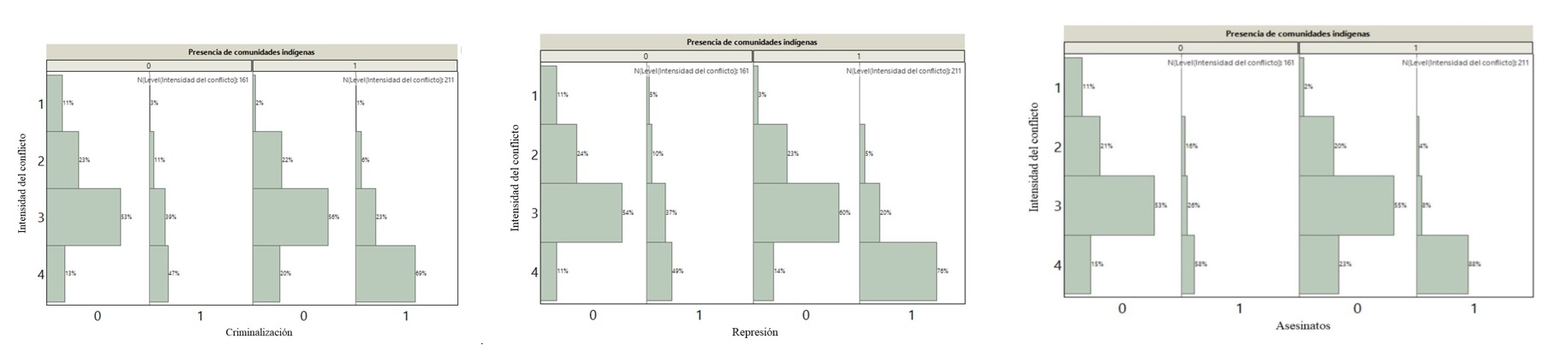 Este es un dato clave para comprender las condiciones contextuales y materiales que podrían explicar la intensidad del conflicto. Aquí el cruce de variables resulta útil para estudiar dinámicas de resistencia y confrontación a la megaminería y los resultados que derivan de escenarios de latente, baja, media o alta intensidad. La dimensión de los sujetos involucrados en la defensa ambiental es otro de los hallazgos fundamentales de este trabajo, pues hemos encontrado una asociación significativa (con 99% de confianza) entre la presencia de pueblos indígenas y hechos de criminalización (prueba χ² de Pearson = 8,62; valor-p < 0.00001), represión (prueba χ² de Pearson = 7.40; valor-p < 0.00001) y asesinato en los conflictos mineros (prueba χ² de Pearson = 7,97; valor-p < 0.00001).