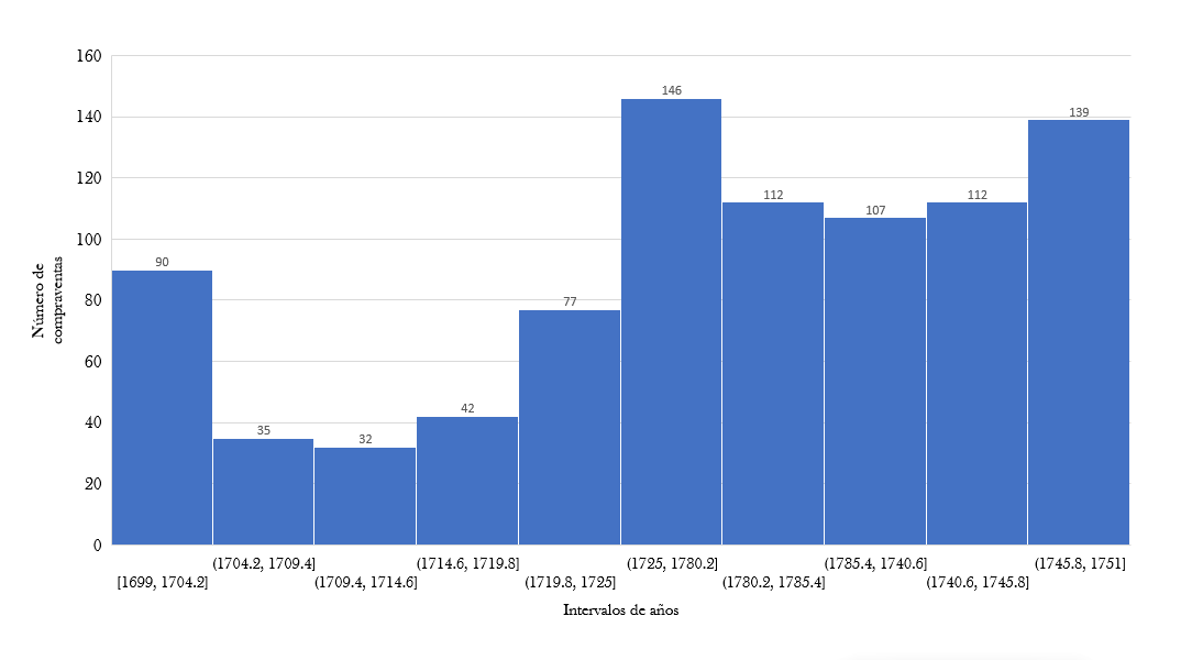 A partir de ese discordante primer lustro, puede comprobarse que el mercado encontró una dinámica natural que rondaba la media de siete transacciones por año. Algo que cambió repentinamente a partir de la década de 1720, cuando comenzó un incremento vertiginoso de casi 100%. Un crecimiento que, incluso, se superaría en la década de 1730, cuando además la base de compraventas ya era mucho más numerosa. Cifras que son prácticamente coincidentes con lo que acaecía en otra importante ciudad del imperio en aquellas fechas, como lo era Buenos Aires. Allí el mercado inmobiliario experimentó un crecimiento de 25 operaciones anuales de promedio entre 1716 y 1718, a 45 operaciones anuales entre 1719 y 1720, 51 de promedio en 1726 y 1727, 74 operaciones anuales en el trienio 1728-1730 y 106 en 1758 (Saguier, 2007).