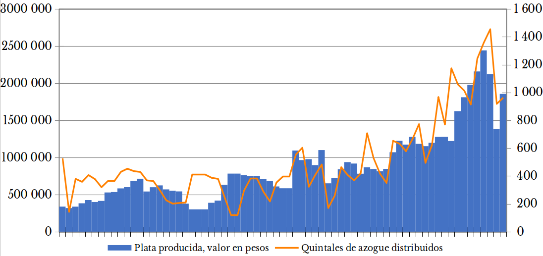 Ahora bien, pareciera difícil explicar la razón por la que el único valor discordante con la tendencia general corresponde al lustro de tránsito entre el siglo xvii al xviii. Pero coincide con dos fenómenos esclarecedores, como lo son por un lado el inicio de la serie completa de protocolos y, por otro, con un periodo de despunte de la producción argentífera en sus minas (véase gráfica 2), que también se ajustaría a los datos de acuñación aportados por Pedro López (1888). La primera de las explicaciones podría indicar que en esos primeros años se formalizaron muchas de aquellas escrituras que se encontraban pendientes de años anteriores, toda vez que las últimas que aparecen con anterioridad son de 1696.20 La segunda no tiene mayor necesidad de aclaración, al existir más capital circulante y sus beneficiarios dedicarlo a invertir en uno de los activos preferidos de la época, los bienes raíces. Bienes inmuebles de tipo habitacional y generadores de rentas que, por ejemplo, cuando se llegaba al culmen social con la obtención de un título nobiliario, eran de los principales que se vinculaban a los mayorazgos correspondientes al honor adquirido y que garantizaban su perpetuidad. Un sólido valor que cuando se ponía en duda su titular no se escatimaban esfuerzos en disputarlos y asentarlos, como hizo la marquesa de San Clemente en 1770 para recuperar una casa grande ubicada en el real de Mellado que estaba vinculado a su título.21