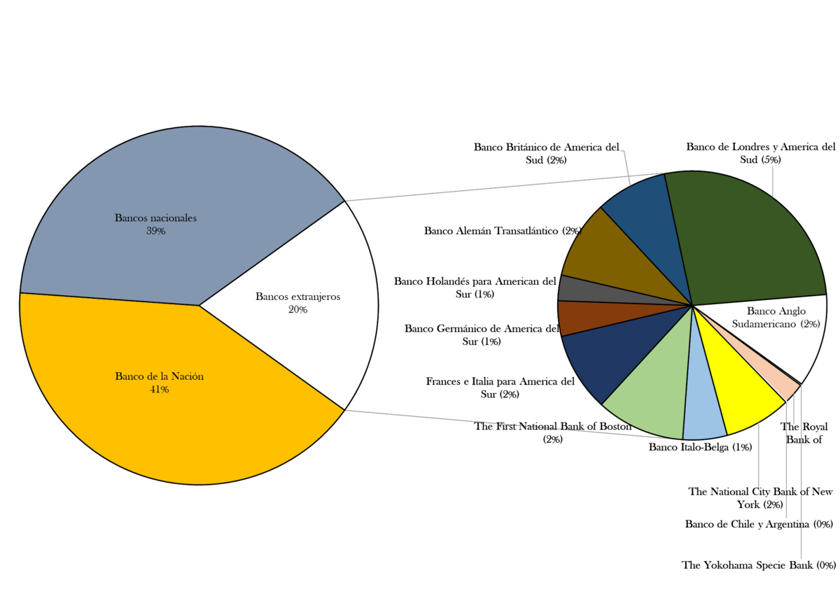 Dada su importancia y papel especial dentro del sistema bancario argentino, debe hacerse un comentario aparte respecto al Banco de la Nación. Debido a su gran volumen de operaciones y la amplia presencia en todo el territorio nacional a través de su extensa red de agencias y sucursales, el Banco de la Nación ocupaba un lugar central en el mercado bancario argentino (Regalsky, 2010). En ausencia de un banco central durante este periodo, el Banco de la Nación era la institución oficial más importante del país, y se desempeñaba como agente financiero del estado y banca de desarrollo. Con más de 233 oficinas en todo el territorio argentino, acumulaba más del 40% de los activos del sistema bancario comercial, entre un 40% y 50% de sus depósitos totales y entre un 25% y 35% del crédito. Como parte de sus funciones cuasi públicas, el Banco de la Nación estaba autorizado a redescontar documentos comerciales y oficiales de otras instituciones bancarias privadas, proveyéndolas de efectivo en caso de necesidad de liquidez. En 1925, su cartera de redescuentos era de 404 millones, un monto equivalente al 40% de su portafolio de préstamos. A su vez, por el lado del pasivo el Banco de la Nación podía obtener liquidez de la Caja de Conversión, la entidad responsable de la emisión monetaria en el país y de la conversión de billetes de curso legal a oro.