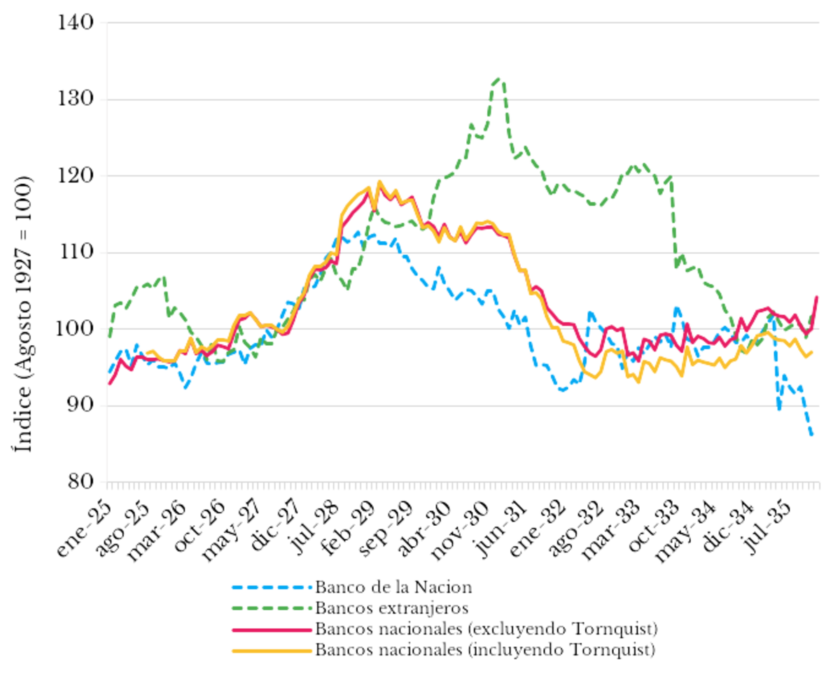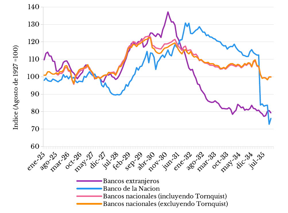 Los depósitos del Banco de la Nación, los cuales se habían incrementado un 12% hasta agosto de 1928, se estancaron y comenzaron a declinar desde junio de 1929. Contrariamente, los depósitos del resto de los bancos nacionales continuaron en firme expansión hasta el pico de marzo de 1929, ubicándose a un 19.3% encima de su nivel al momento de la restauración de la convertibilidad del peso al oro, para comenzar a decaer posteriormente. Por su parte, los bancos extranjeros muestran un comportamiento similar al resto, aunque se observa un estancamiento de sus depósitos que comienza con anterioridad al freno en los bancos nacionales.15
