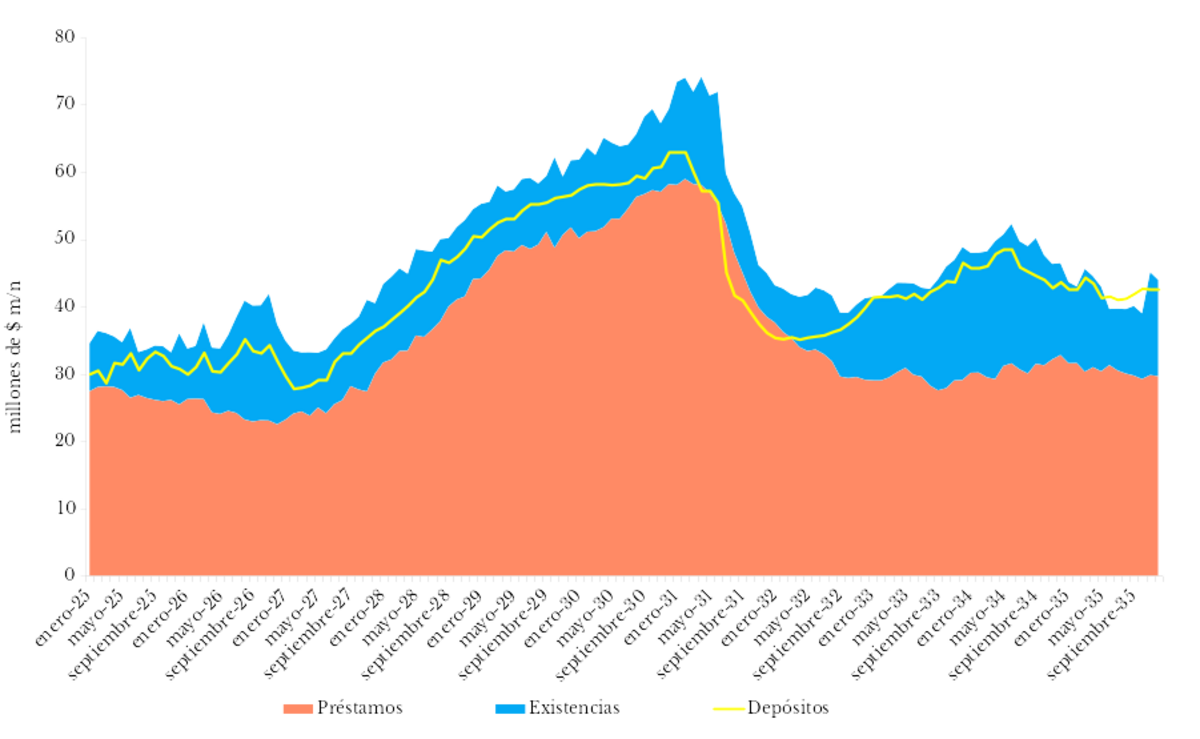 En este artículo estudiamos la evolución del sistema bancario con una nueva base de datos, la cual fue construida a partir de los balances de una amplia muestra de bancos comerciales que operaron en el país entre 1925 y 1935. Los datos son recolectados del Monitor de Sociedades Anónimas, donde se reportaron las principales cuentas del activo y pasivo para una selección de bancos comerciales con periodicidad mensual.11 El número de bancos incluidos en la fuente varía a lo largo del periodo considerado, entre 28 y 31, además refiere a instituciones que operaban en la Capital Federal o, simultáneamente, en la Capital Federal y el interior a través de agencias o sucursales. Con base en los datos del censo de 1925, los bancos incluidos en el Monitor representan el 94.4% de los depósitos totales, 92.1% de las existencias, y 84% de la cartera de préstamos de la banca comercial, proporcionando así una muestra representativa de las tendencias y comportamientos del sistema bancario en su conjunto en un nivel nacional. Dada la importancia dentro del sistema financiero y de la economía argentina, hemos agregado el Banco Tornquist, el cual no aparece incluido en la base del Monitor.12 La información para el Banco Tornquist se colectó manualmente revisando las publicaciones diarias del Boletín Oficial de la República Argentina, donde el banco reportaba sus balances mensuales. Los depósitos, préstamos y existencias del Banco Tornquist en 1925 representaban 1.9, 2.8, y 1.6% del total del sistema bancario respectivamente, lo que mejora aún más la participación de la muestra.
