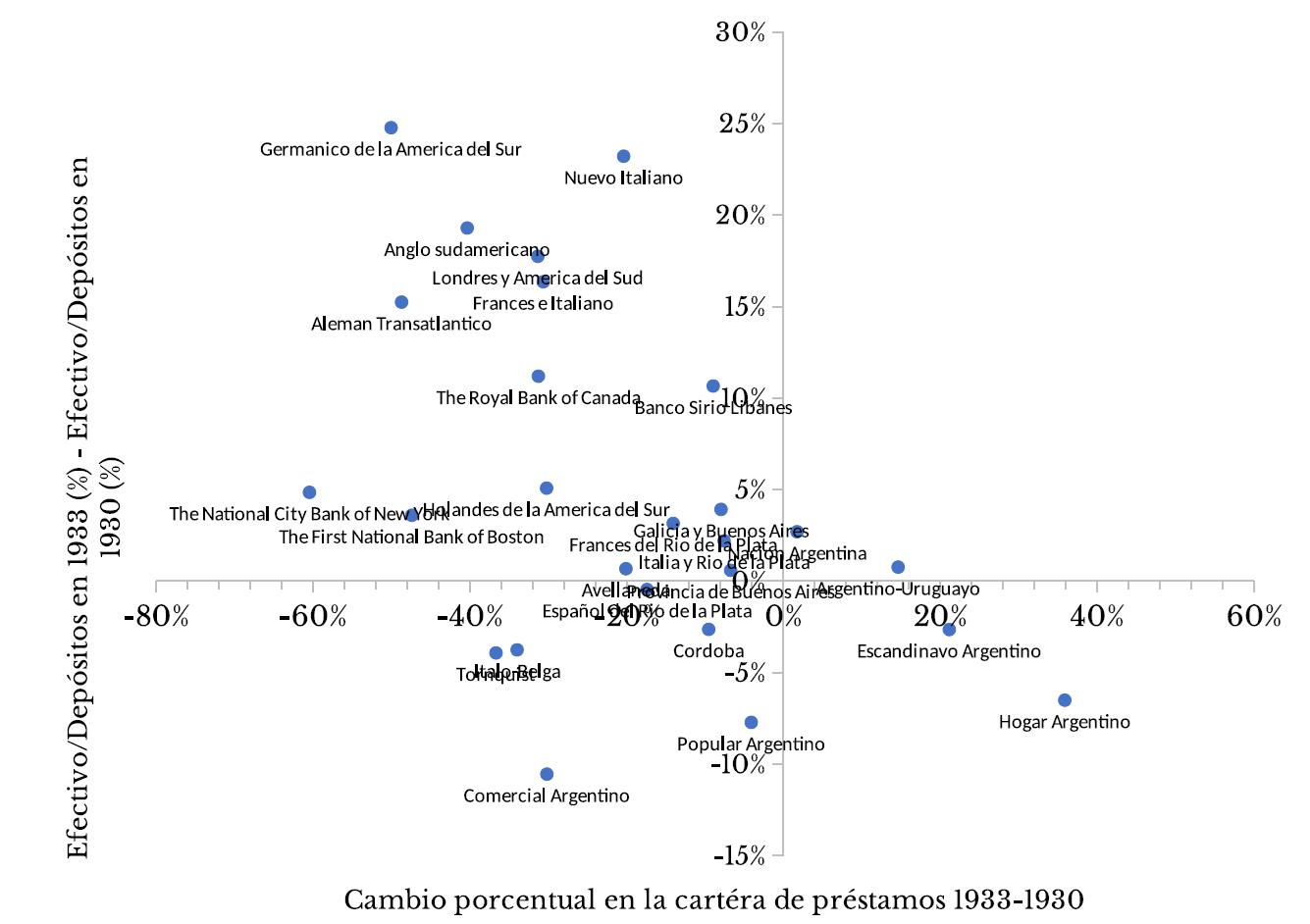 Lo particularmente llamativo es que este fenómeno de acaparamiento de liquidez (liquidity hoarding) mediante la acumulación voluntaria de reservas en efectivo es una singularidad de la banca extranjera. De hecho, contrariamente a ellos, los datos no reflejan un comportamiento similar por parte de los bancos nacionales, ya que no se observan aumentos generalizados de existencias ni tampoco ajustes mayores en sus carteras de préstamos. La gráfica 7 muestra el cambio en el cociente entre existencias y depósitos de cada banco entre 1931 y 1933, junto con el cambio correspondiente en el nivel de préstamos, de donde se pueden hacer dos observaciones importantes. La primera es la relación negativa entre el aumento del coeficiente de reservas voluntarias y la evolución de la cartera de préstamos, lo que significa que los bancos que más aumentaron sus existencias, y/o perdieron depósitos, fueron también los que ajustaron más fuertemente su cartera de créditos. La segunda es que se observan dos grupos claramente diferenciados, mientras que los bancos extranjeros aparecen mayoritariamente ubicados en el cuadrante superior izquierdo como resultado de los cambios en sus balances anteriormente descriptos, los bancos nacionales están más dispersos lo que muestra un comportamiento más variado. En general, a excepción del Banco Sirio Libanés, los aumentos del ratio efectivo-depósitos de la banca nacional fueron considerablemente menor que el de los bancos extranjeros, y en muchos casos incluso se redujo. La actividad crediticia (y su relación con los cambios entre efectivo y depósitos) fue más heterogénea también, ya que algunos bancos aumentaron sus préstamos mientras otros los redujeron al tiempo que morigeraban o acentuaban sus tenencias voluntarias de efectivo.