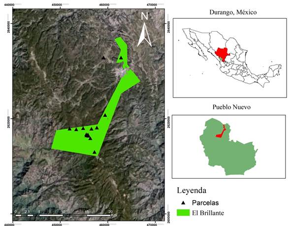 El estudio se realizó en los ecosistemas forestales del ejido el Brillante, el cual se ubica en el municipio de Pueblo Nuevo, Durango, en la Sierra Madre Occidental (Figura 1), entre las coordenadas 23° 40’ 04” y 23° 47’ 54” de latitud norte y 105° 21’ 31” y 105° 29’ 52” de longitud Oeste (Figueroa-González et al., 2013). La altitud oscila entre 2,200 y 2,800 msnm.