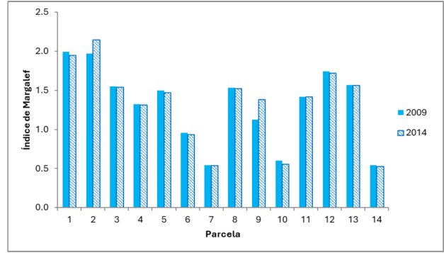 Figura 2 Índice de Margalef, estimado en el ejido el Brillante, registrado en dos inventarios (2009 y 2014).