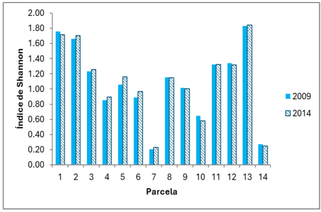 Los resultados del índice de Shannon (Figura 3) indican que las parcelas con mayor diversidad de especies son la 13, 1 y 2, y las de menor diversidad la 7, 14 y 10. En las parcelas 2, 3, 5, 6 y 7 se registró un incremento en el valor de este índice, en el resto de las parcelas se observa que el índice de Shannon se mantuvo estable o presentó una ligera disminución durante el periodo evaluado. siendo esta disminución, no significativa estadísticamente.