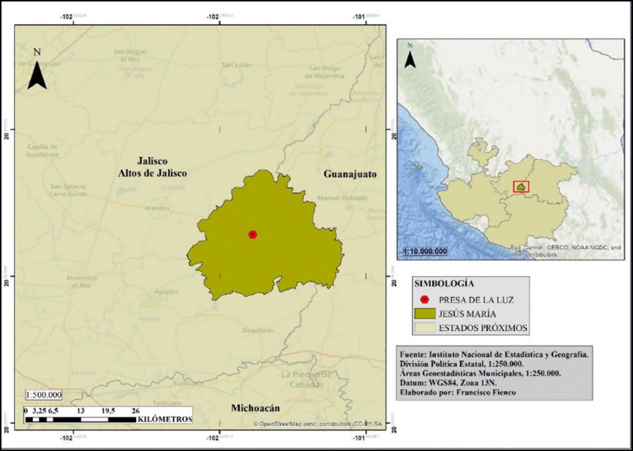 El sitio arqueológico Presa de la Luz se ubica en el noroccidente de México, región que corresponde a los Altos de Jalisco, municipio de Jesús María (Figura 1). Este escenario, bajo sus condiciones ambientales y geográficas, presenta características favorables para el establecimiento de grupos humanos, debido a sus suelos fértiles, zonas de irrigación, áreas boscosas en galerías y cerros (Weigand y García de Ezra, 1999), particularidades que en la actualidad sirven para el desarrollo de actividades agrícolas (maíz y agave) y ganaderas.