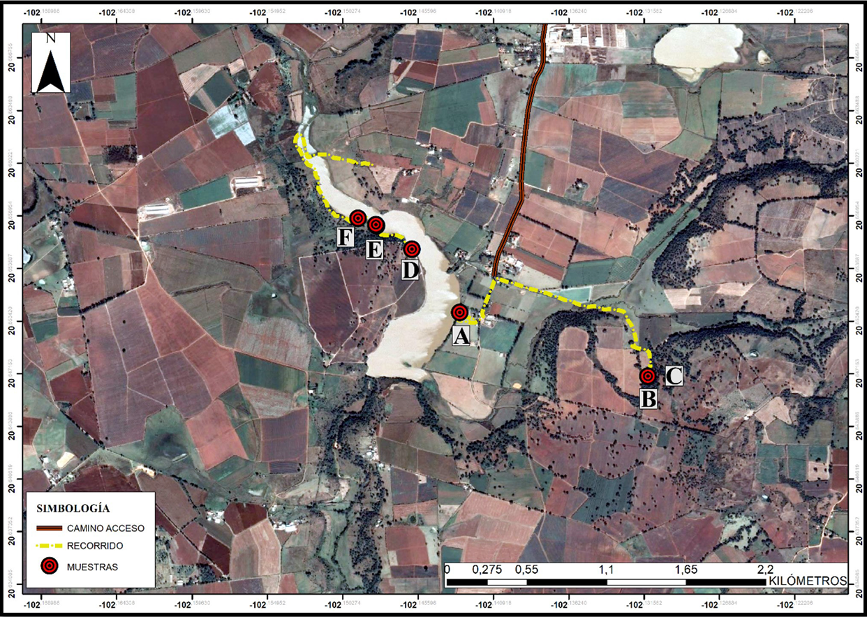 El transecto determinado para la toma de muestras se formuló según la accesibilidad y las condiciones en las que se encontraban los vestigios (Figura 2). Se seleccionaron los metates y los pocitos que se encuentran en la superficie, mientras que los materiales restantes del registro arqueológico se localizan sumergidos por el caudal de la presa o fueron nuevamente cubiertos con tierra, por ende, no fueron considerados.