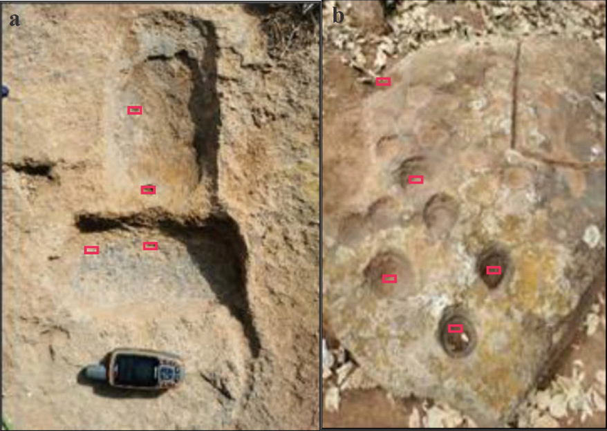 Figura 3 Artefactos del registro arqueológico analizados: a) Metates y b) Piedra de pocitos. Autoría Rodrigo Esparza.