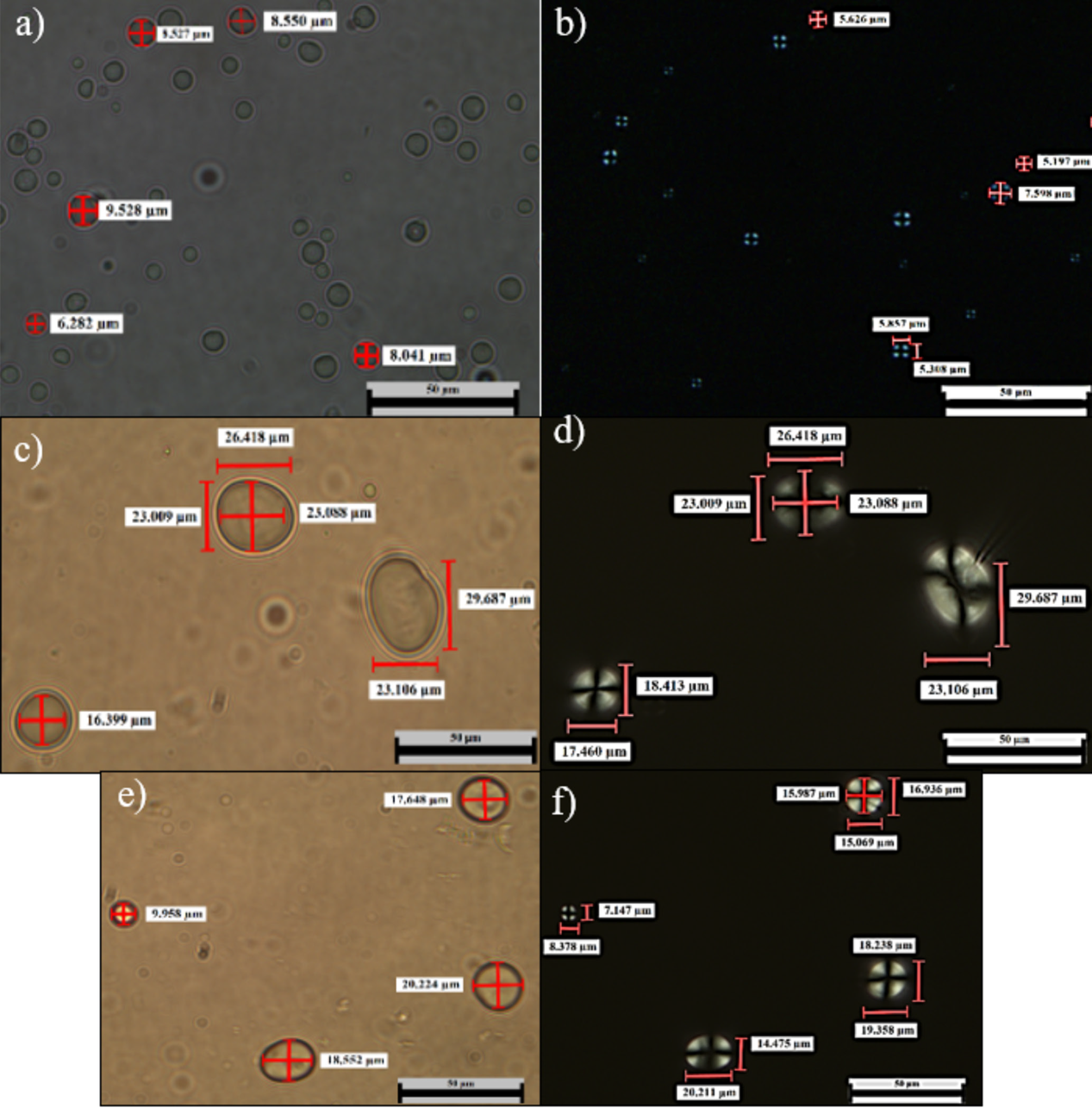 Figura 4. Gránulos de almidón de muestras de referencia con microscopio en luz transmitida y luz polarizada: a) y b) maíz - c) y d) frijol amarillo - e) y f) frijol verde. Autoría Ana Coria y Francisco Fienco.