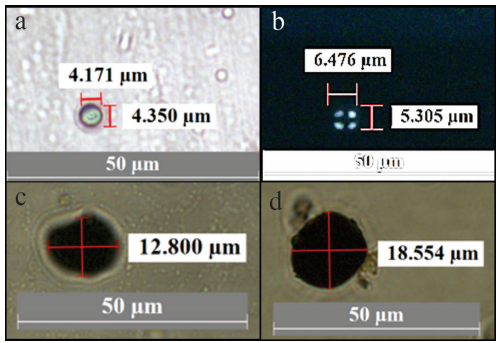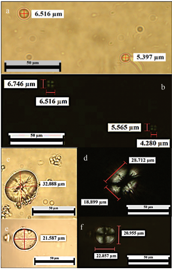 Por otro lado, los gránulos de frijol verde identificados tienen formas circulares y ovaladas. Su tamaño promedio varía entre 15 a 25 µm. Mientras tanto, los gránulos de almidón del frijol amarillo se encuentran entre 10 y 20 µm de diámetro. Sus formas frecuentes son redondeadas y ovaladas. En los gránulos de almidón del frijol amarillo, bajo luz polarizada, se nota la cruz de extinción al cambio de luz, lo que hace fácil su identificación. Los diámetros se encuentran entre 8 a 18 µm que coincide parcialmente con los gránulos de frijol amarillo con luz transmitida (Figura 4).