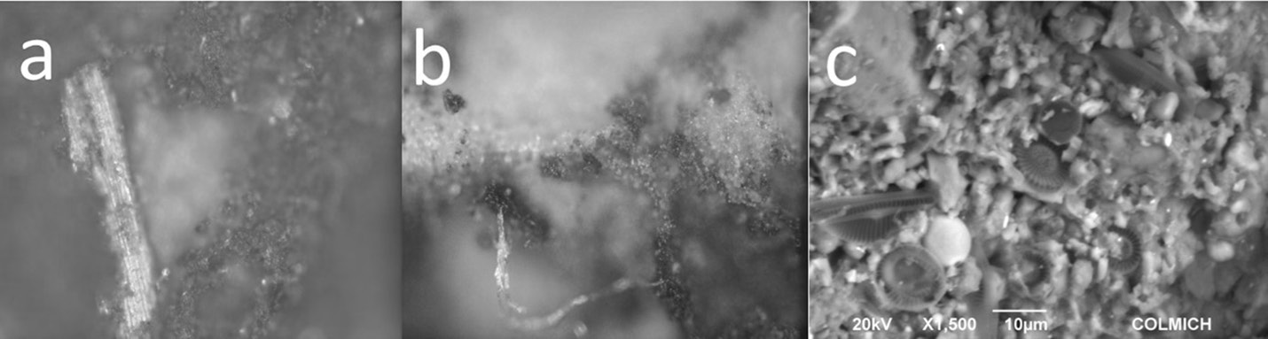 En la Figura 8 se muestran las imágenes obtenidas mediante microscopio óptico, así como las imágenes obtenidas con Microscopio electrónico de barrido (MEB) de las impresiones de PVS, así como los sitios de donde fueron colectadas. El análisis con microscopio óptico de la impresión de PVS tomada en uno de los pocitos situado en el área D (M25-P6) permitió identificar fibras vegetales, mientras que con el SEM se observaron microalgas fosilizadas conocidas como tierra de diatomeas (Figura 8). Los análisis de laboratorio dentro de las investigaciones arqueológicas han servido para interpretar el registro material encontrado en diferentes sitios, como las obtenidas del sitio Presa de la Luz.