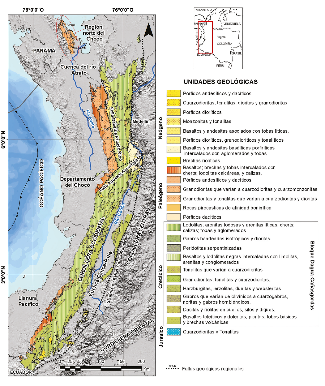 La Cordillera Occidental es una de tres cordilleras en las que se dividen los Andes en Colombia. Desde el punto de vista geográfico, la Cordillera Occidental comprende la cadena montañosa que se levanta entre la cuenca del río Cauca al oriente, la llanura Pacífica y la cuenca del río Atrato al occidente (Figura 1). Como límites geológicos del área de estudio, se consideran, al oriente la Falla Cauca-Almaguer y al occidente las unidades sedimentarias que ocupan el Andén Pacífico y la cuenca del río Atrato. Aunque la mayor parte del área de estudio se encuentra en la Cordillera Occidental, en algunos sectores se analiza la vertiente occidental de la cordillera Central y la cuenca del río Cauca. Adicionalmente, debido a la presencia de unidades Paleocenas en el norte del departamento del Chocó, analizaremos la información geológica de parte del sector conocido como región norte del Chocó, específicamente las unidades volcánicas y plutónicas que ocurren en los municipios de Unguía y Acandí de ese departamento (Figura 1).