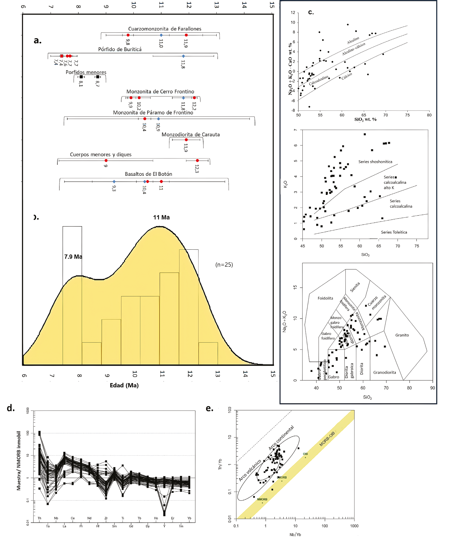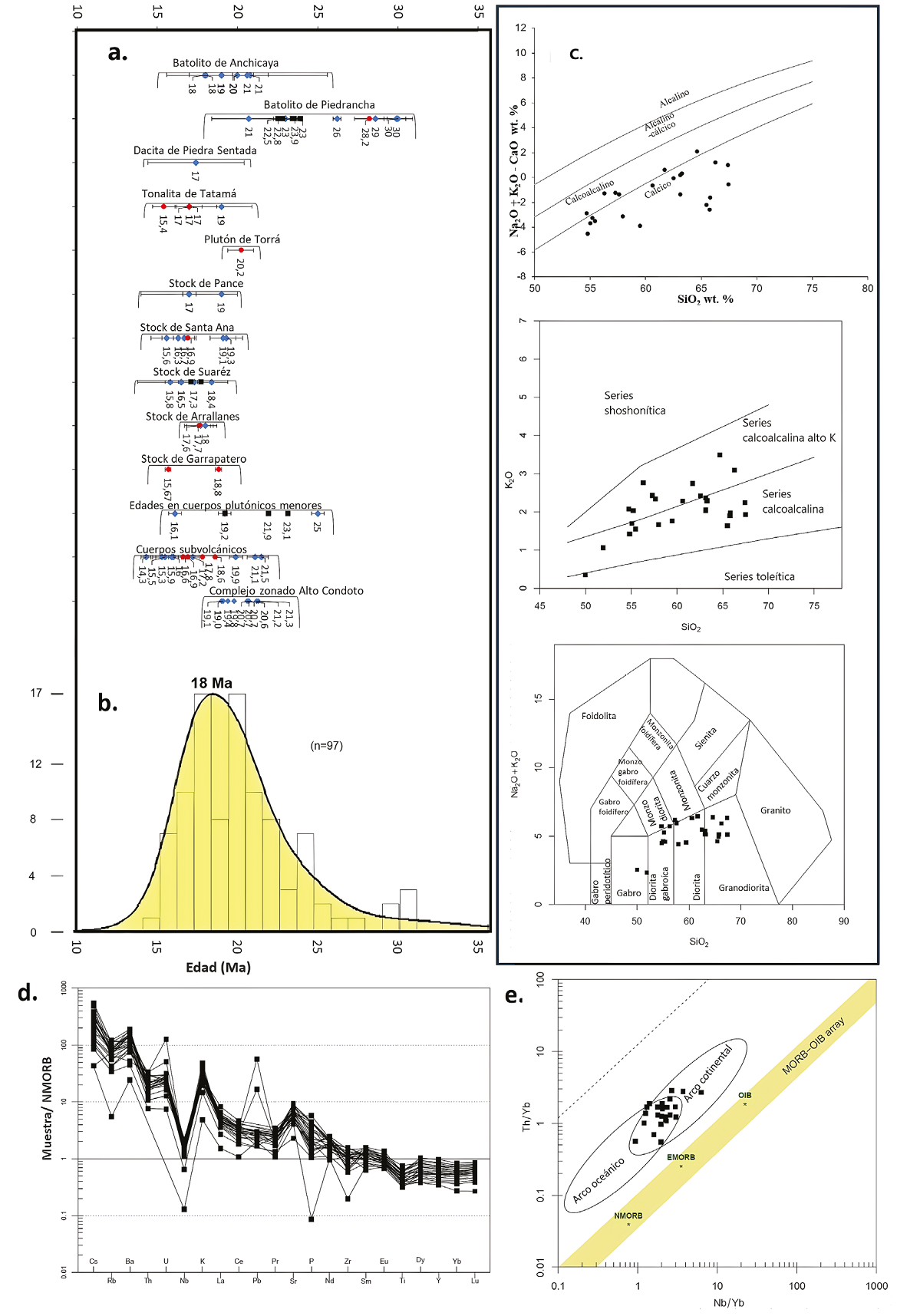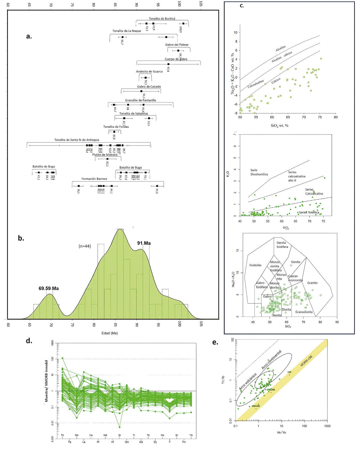 Figura 10 Edad y composición de los plutones del pulso magmático Piedrancha-Tatamá. a. Diagrama de correlación de plutones; b. Diagrama de densidad de Kernel a partir de las edades U-Pb, 40Ar-39Ar y K/Ar de los plutones y unidades volcánicas; c. Diagramas de clasificación de muestras de plutones; d. Diagrama de elementos trazas normalizados al N-MORB; e. Diagrama de ambiente tectónico (Pearce, 2008).