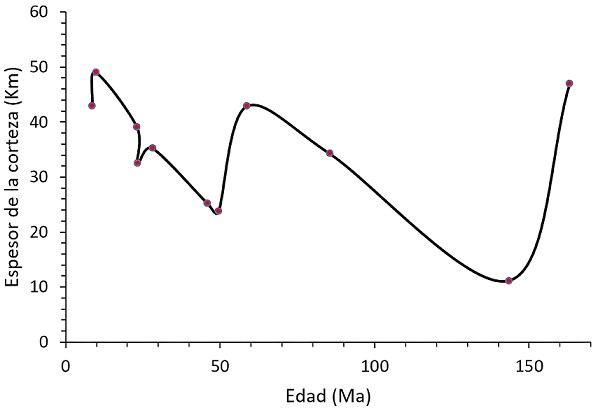 Tabla 3 Espesores de corteza de muestras con datación representativas de los diferentes pulsos magmáticos.
