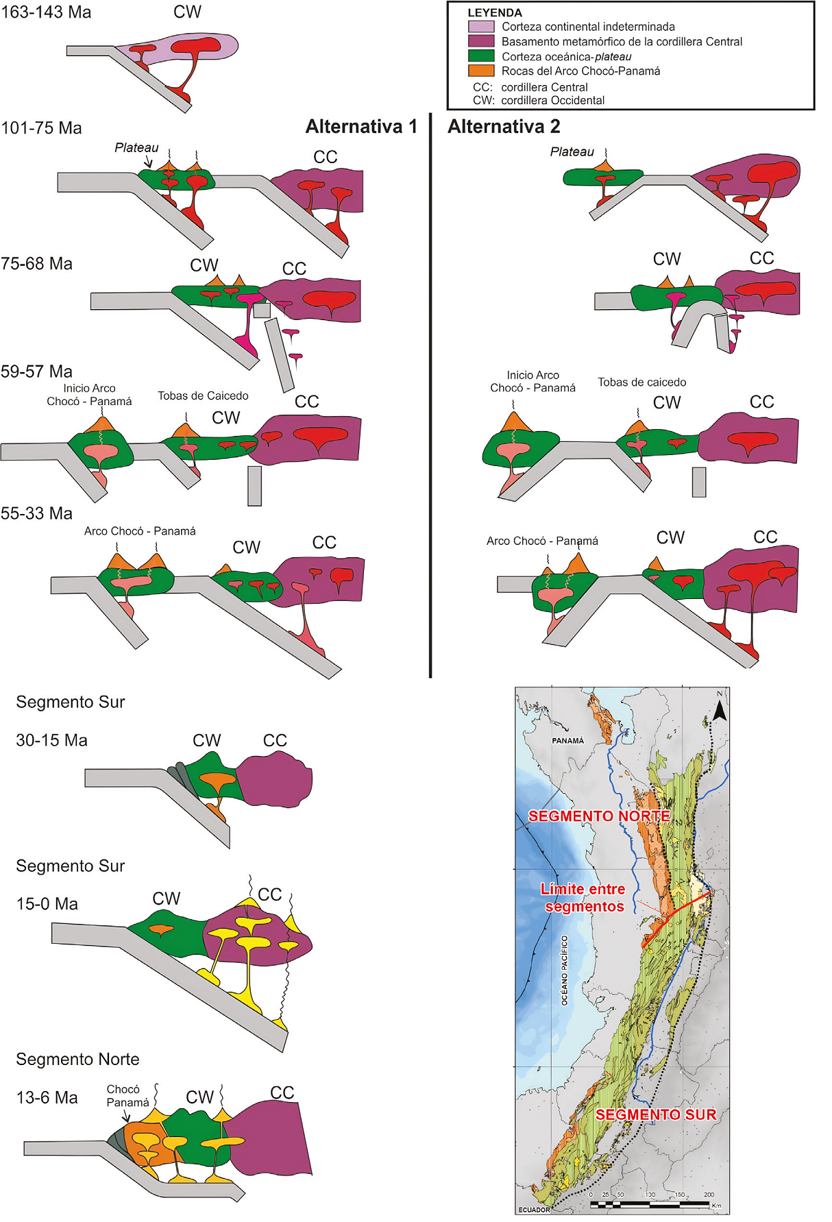 Algunos autores consideran que el Arco ChocóPanamá se inició a lo largo del margen occidental del plateau ca. 72 Ma, en concordancia con los datos bioestratigráficos y geocronológicos de secuencias de arco temprano in situ en Panamá (Buchs et al., 2010; Wegner et al., 2011). En Colombia los datos del Arco Chocó-Panamá sugieren que la cristalización de rocas del arco inició ca. 59 Ma y continuó hasta al menos ca. 37 Ma, sin que se reconozca migración del magmatismo. Al mismo tiempo en la Cordillera Occidental, pero en una posición más oriental, cristalizaron rocas volcánicas y volcanoclásticas formadas en un arco de margen continental de afinidad boninítica, denominadas Tobas de Caicedo (Correa-Restrepo et al., 2023), emplazadas en basaltos de plateau y en vulcanitas del arco de islas Cretácico (Arco Barroso Sabanalarga). Ambos arcos (Chocó-Panamá y las rocas boniníticas) iniciaron su actividad al tiempo, pero en diferentes posiciones geotectónicas. Más al oriente sobre la Cordillera Central, pero ligeramente posterior a la cristalización de las rocas boniníticas, cristalizaron plutones con afinidad de arco de margen continental. Lo que muestra la compleja historia magmática poscolisional entre el plateau oceánico y la margen continental en el norte de los Andes y la dificultad que existe para proponer los modelos geológicos con los pocos datos existentes. La edad y la composición química de las rocas volcánicas y plutónicas que conforman el arco es comparable (bloques Acandí-Santa Cecilia La Equis, Mandé-Santa Cecilia La Equis y NapiTimbiquí; Zapata-García y Rodríguez-García, 2020). Estas unidades ocupan una posición geotectónica similar.