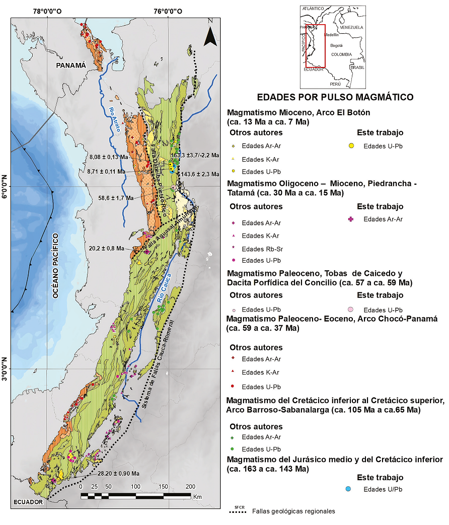Se recopilaron los análisis geocronológicos de las unidades que conforman cada arco magmático de la Cordillera Occidental desde el Jurásico hasta el Mioceno (Álvarez y Parra, 1979; Álvarez y Linares, 1979; ANH-U. de Caldas, 2011; Arboleda et al., 2009; Aspden et al., 1987; Barbosa-Espitia et al., 2019; Botero Arango, 1975; Brook, 1984; Buchely et al., 2009; Calle y González, 1980; Cetina et al., 2019; Correa-Restrepo et al., 2023; Correa et al., 2018, 2020; García et al., 2021; Giraldo, 2017; GRP, 2014; Kerr et al., 1997; Leal, 2011; Lesage, 2011; McCourt et al., 1990; Montes et al., 2015; Muñoz et al., 1990; Nivia, et al., 2019b; Pardo-Trujillo et al., 2020; Peláez et al., 2022; Restrepo et al., 1979; Risnes, 1995; Rodríguez-García et al., 2023; Rodríguez-García y Bermúdez-Cordero, 2015; Rodríguez y Zapata García, 2012; Sillitoe et al., 1982; Villagómez, 2010; Villagómez et al., 2011; Weber et al., 2015; Zapata-Villada et al., 2021; Zapata-García y Rodríguez-García, 2020; Zapata y Rodríguez, 2011). En algunas unidades no descritas se realizaron nuevos análisis por el método U-Pb en circón, mediante ablación laser, junto a espectrometría de masas de acoplamiento inductivo a plasma (LA-ICP-MS, por sus siglas en inglés) y por el método 40Ar-39Ar en roca total.