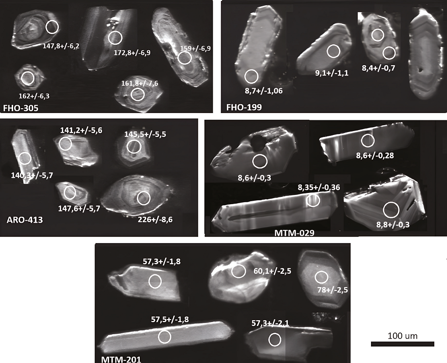 Los circones fueron concentrados en el Laboratorio Químico del Servicio Geológico Colombiano, sede Medellín, utilizando separación hidrodinámica y magnética, y algunas muestras se concentraron en el campo mediante bateo; luego se seleccionaron manualmente con la ayuda de una lupa binocular Olympus en el Laboratorio de Petrografía de la sede Medellín del Servicio Geológico Colombiano. Las superficies pulidas de los granos de circón fueron fotografiadas en catodoluminiscencia (CL), utilizando un microscopio electrónico de barrido JEOL JSM IT-300LV equipado con un detector de catodoluminiscencia Gatan miniCL EGA 0028. Los resultados isotópicos de los análisis realizados se presentan en la Tabla Suplementaria 3 (TS3).