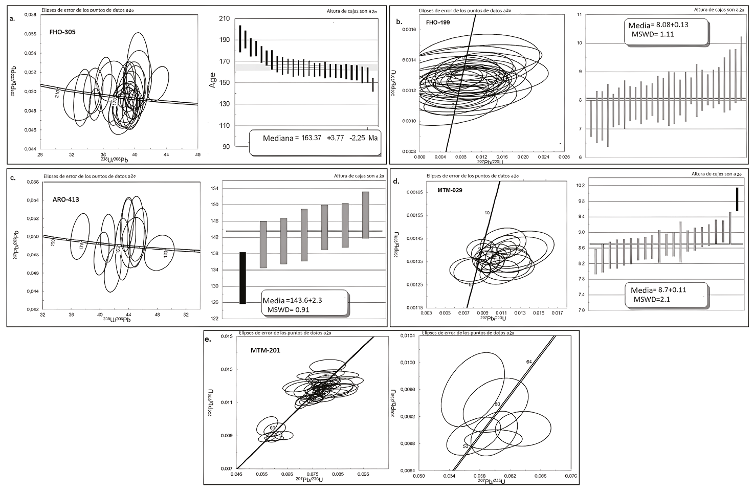 Las dataciones reportadas corresponden a las obtenidas a partir de la relación 206Pb/238U. La discordancia se calculó con la siguiente fórmula (%) Disc=((207Pb/235U - 206Pb/238U)/206Pb/238U)*100 y el error es el asociado a la edad 206Pb/238U. Todas las edades finales fueron calculadas con el software Isoplot/Ex 3.75-4.15 (Ludwig, 2012). Como patrones de referencia se usaron: Plešovice (Sláma et al., 2008), FC-1 (Coyner et al., 2004), Zircón 91500 (Wiedenbeck et al., 1995, 2004) y Mount Dromedary (Renne et al., 1998). Los puntos analizados en los circones fueron de 20 micrones de diámetro. La reducción de datos se realizó mediante el programa Iolitev2.5® en IGORPro6.3.6.4® (Hellstrom et al., 2008; Paton et al., 2010).