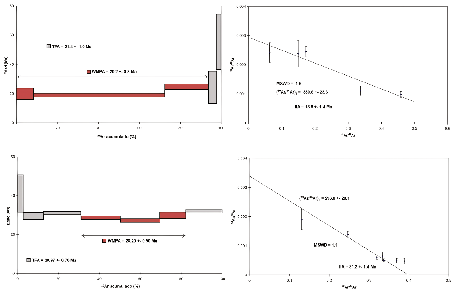 Los análisis de argón fueron realizados en el laboratorio de ActLabs de Canadá por el método 40Ar-39Ar step heating dating en roca total. Las rocas fueron preparadas en un molino no contaminante en malla-200. Las muestras envueltas en papel aluminio se cargaron en un recipiente de cuarzo sellado al vacío con sales de K y Ca y paquetes de biotita LP-6, utilizados como monitor de flujo intercaladas con las muestras. Las muestras fueron irradiadas en el reactor nuclear durante 48 horas. Se colocaron los monitores de flujo cada dos muestras, permitiendo la determinación precisa de los gradientes de flujo dentro del tubo. Después de que se corrieron los monitores de flujo, los valores J fueron calculados para cada muestra, utilizando el gradiente del flujo medido. La biotita LP-6 tiene una edad supuesta de 128.1 Ma. La lectura de gradiente de neutrón no supera 0.5% en tamaño de muestra. La composición isotópica del argón fue medida en un espectrómetro de masas estático Micromass 5400. La lectura del blanco 1200°C de 40Ar no excede n*10-10 cc STP. Las edades plateau obtenidas a partir de los espectros de edades compuestos por las diferentes fracciones de gas liberado por calentamiento gradual de las muestras representan más del 50% del 39Ar liberado por la muestra, y las fracciones liberadas están dentro de un nivel de confianza de 1s.