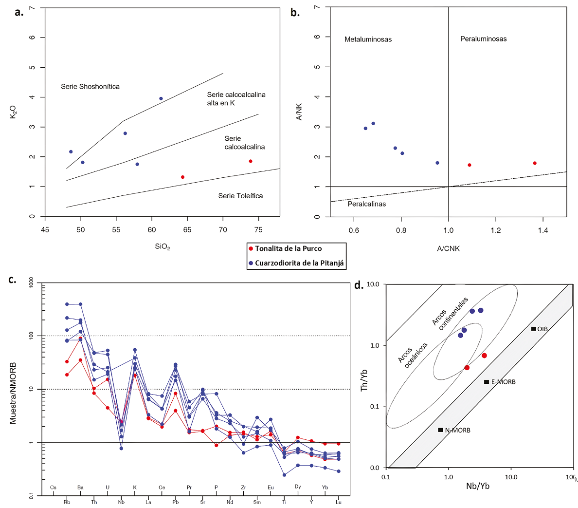 Figura 6 Diagramas de análisis geoquímico de la actividad magmática de las rocas formadas en el Jurásico Medio y el Cretácico Temprano. a. Diagrama de SiO2 vs K2O (Peccerillo y Taylor, 1976); b. Diagrama A/CNK vs A/NK (Shand, 1943); c. Diagrama normalizado al N-MORB de (Sun y McDonough, 1989); d. Diagrama Nb/Yb vs Th/Yb con campos discriminatorios de tipo de arco (Pearce, 2014).