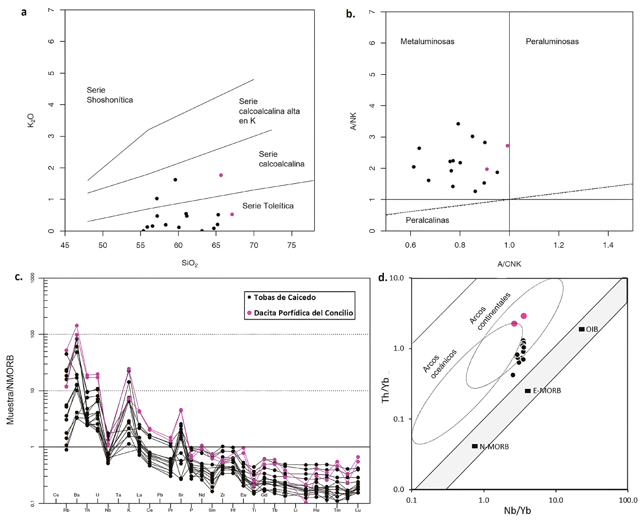 Figura 8 Diagramas de análisis geoquímico de la actividad magmática de las rocas formadas en el Paleoceno (Tobas de Caicedo y Dacita Porfídica del Concilio). a. Diagrama de SiO2 vs K2O (Peccerillo y Taylor, 1976); b. Diagrama A/CNK vs A/NK (Shand, 1943); c. Diagrama normalizado al N-MORB de Sun y McDonough (1989); d. Diagrama Nb/Yb vs Th/Yb con campos discriminatorios de tipo de arco (Pearce, 2014).