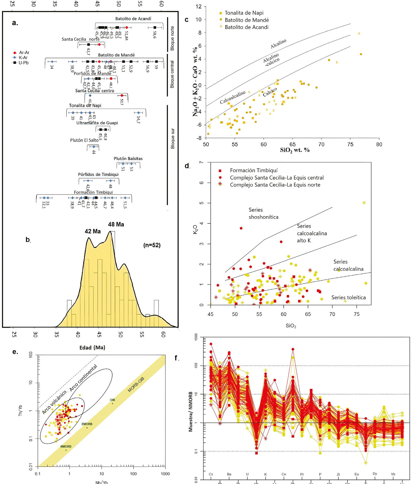 Figura 9 Edad y composición de los plutones y unidades volcánicas del arco Chocó-Panamá. Rojo unidades volcánicas y amarillo resultados en rocas plutónicas. a. Diagrama de correlación de plutones; b. Diagrama de densidad de Kernel partir de las edades U-Pb, 40Ar-39Ar y K/Ar de los plutones y unidades volcánicas; c. Diagramas de clasificación de muestras de plutones; d. Diagrama de SiO2 vs. K2O (Peccerillo y Taylor, 1976); e. Diagrama de ambiente tectónico (Pearce, 2008); f. Diagrama de elementos trazas normalizados al N-MORB.