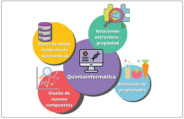 La Quimioinformática (Figura 1) es una disciplina cuyo objetivo es la aplicación de los recursos informáticos para resolver problemas en Química (Gasteiger, 2020; Miranda-Salas et al., 2023). Estos problemas o aplicaciones abarcan frecuentemente: i) la falta de organización de la información en bases de datos moleculares (p. ej., quimiotecas) que facilite su búsqueda, acceso y actualización; este proceso es relevante y un desafío por el incremento exponencial de los datos químicos; ii) el análisis de las relaciones que hay entre las estructuras químicas y una o varias propiedades de interés (por ejemplo, el sabor, las propiedades biológicas, farmacéuticas o farmacológicas, etc.) de nuevos compuestos o de compuestos químicos existentes, y iii) la predicción de propiedades a partir de relaciones complejas. A su vez, la predicción de propiedades está directamente relacionada con otras dos acciones muy comunes en la Quimioinformática: A) diseñar nuevos compuestos de novo; y B) filtrar colecciones de compuestos conocidos para seleccionar los que tienen las propiedades deseadas; esta es una práctica empleada durante varios años, pero en constante mejora y optimización, conocida como cribado (del inglés, screening), tamizaje o evaluación computacional de bases de datos moleculares.