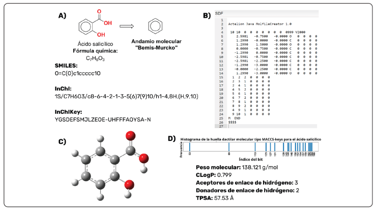 Si bien la representación gráfica de las moléculas se realiza a través de notaciones o fórmulas condensadas, a través de múltiples formatos, la representación de las moléculas en las computadoras se da internamente en forma de grafos moleculares del tipo G = (V, E). Esta aproximación coincide con la imagen habitual que tiene un químico de la estructura molecular. Los grafos moleculares están compuestos por nodos V y aristas E. Cada uno de los nodos determina la naturaleza del átomo, por ejemplo, a modo de número atómico, e incluye propiedades como el tipo de enlaces que puede adoptar, las coordenadas tridimensionales, la carga, la configuración isotópica o la quiralidad. Las aristas, por su parte representan la conexión entre los nodos del grafo y representa al enlace químico en las moléculas. Sin embargo, la naturaleza del enlace no está descrita por la arista en sí misma, sino por las propiedades del nodo. El orden de procesamiento del grafo es determinado a través de diferentes algoritmos de la teoría de grafos, que de forma consistente dan lugar a la misma molécula. Para esto, diferentes arquitecturas de algoritmos de lectura son implementados por los programas de procesamiento de información química disponibles en la actualidad (Bondy & Murty, 1976). La Figura 2A es un ejemplo de una representación bidimensional de tipo grafo para la molécula de ácido salicílico.