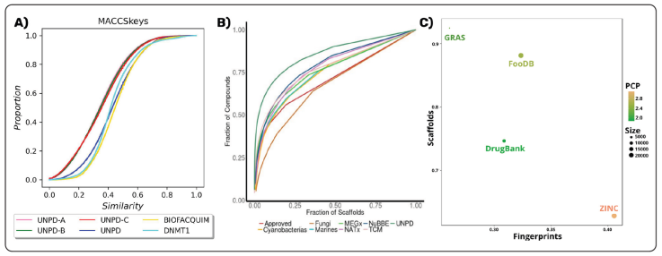 Figura 3 Ejemplos de métodos de visualización utilizados en el estudio de la diversidad química (A) Curvas de similitud acumulada (recuperado de Chávez-Hernández & Medina-Franco, 2023); (B) Curvas de recuperación de estructuras cíclicas (recuperado de Saldívar-González, Valli, Andricopulo, da Silva Bolzani & Medina-Franco, 2019); (C) Cuantificación y visualización de diversidad consenso (modificado de Naveja, Rico-Hidalgo & Medina-Franco, 2018).