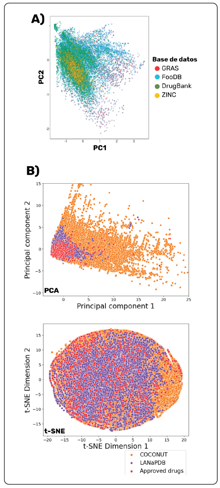 Figura 4 Ejemplo de representaciones visuales del espacio -y multiverso- químico de compuestos de alimentos. (A) ChemMaps comparativo entre FooDB , GRAS, productos naturales en ZINC y moléculas de uso clínico (recuperado de Naveja, Rico-Hidalgo & Medina-Franco, 2018); (B) PCA y t-SNE para LaNaPDB, COCONUT y medicamentos aprobados por la FDA, en términos de propiedades fisicoquímicas de interés farmacéutico (adaptado de Gómez-García et al., 2023).