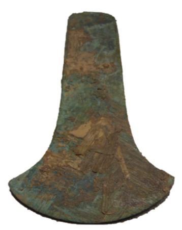 Nótese en este particular ejemplo que la hachuela tiene una forma ligeramente distinta a las ya presentadas, pues tiende más hacia una forma trapezoidal alargada. Esto puede estar relacionado con una variación de estilo en la época, o bien con una distinción implícita con la cual los indígenas comprendían su utilidad específica en una actividad determinada. Al respecto, Manuel Orozco y Berra comenta que existe, de hecho, una distinción en la forma, conforme a la actividad práctica de estas hachas, “las que llevan los mangos rectos servían en el corte de árboles o faenas análogas, y las de mango recurvo eran empleadas en la carpintería” (1880: 291-292). Las variantes de este último tipo de piezas serían las correspondientes a las tajaderas, aunque es permisible suponer que sus dimensiones y aleaciones serían distintas a las utilizadas en las actividades productivas referidas.