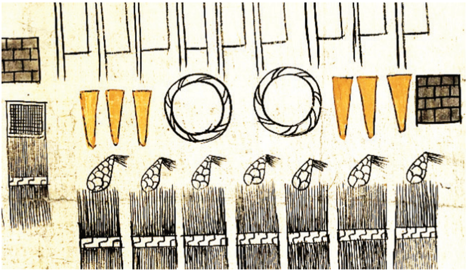 Figura 13 Tributación de tejuelos de oro por parte de Yoaltepec, Puebla y otras provincias (Códice Mendoza, 1992: 40f).