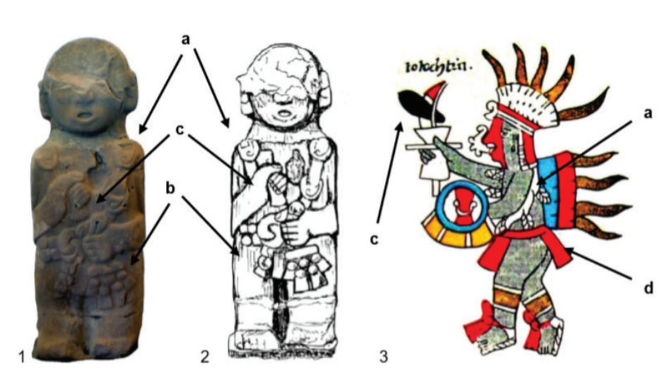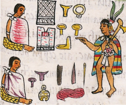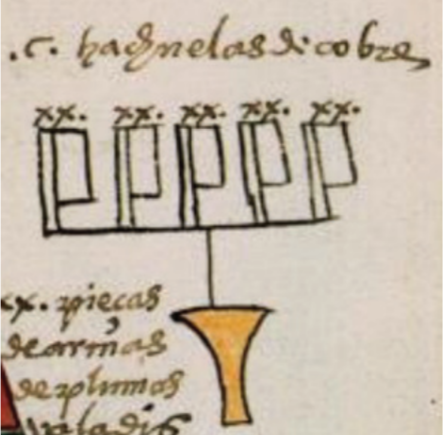 Lo sorprendente en relación con la identificación del material de soporte de las hachuelas, no obstante, es que entre los tributos colectados por mexicas en el Códice Mendoza se presenta el mismo tipo de objeto, que en la glosa se indica como pieza de cobre. Esto, para Tepecoacuilco, en Guerrero, y Quiauhteopan, entre Guerrero y Puebla.