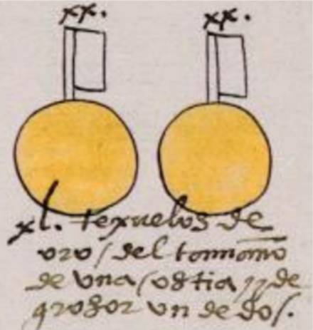 Las hachas doradas referidas parecen coincidir con aquellas descritas por Torquemada. Tales objetos pueden ser reconocidos también en otros documentos pictográficos, entre ellos, el Códice de Huejotzingo, que data de 1531. Ahí se observa, entre una lista de tributos, media docena de hachuelas, identificadas por su forma de representación y situación contextual.4
