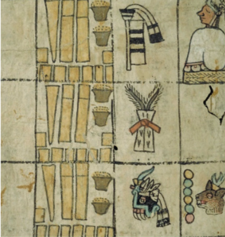Figura 14 Tributación de oro en forma de polvo, cuadretes, barras y posiblemente hachas (Códice Azoyú 2, lámina 12).