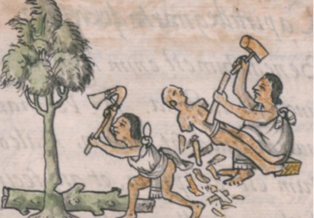 Otro de los contextos en los que se muestra la imagen de un hacha en una actividad práctica, pero distinta de la guerra, es en una lámina del Códice Florentino, en la cual uno de los personajes se encuentra cortando un árbol con dicho instrumento.